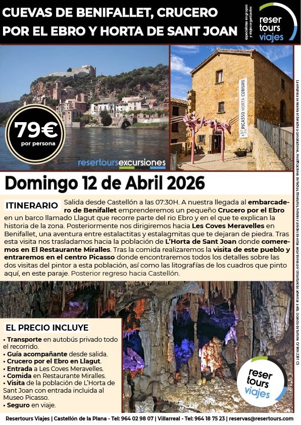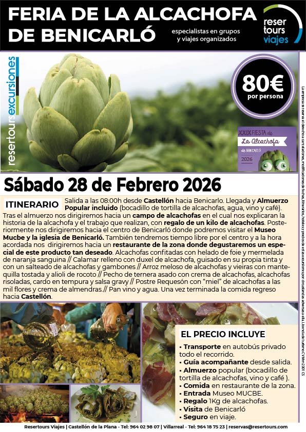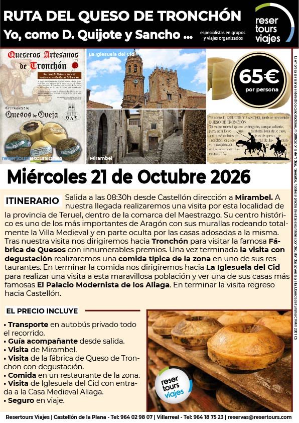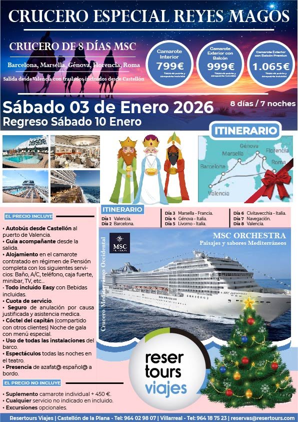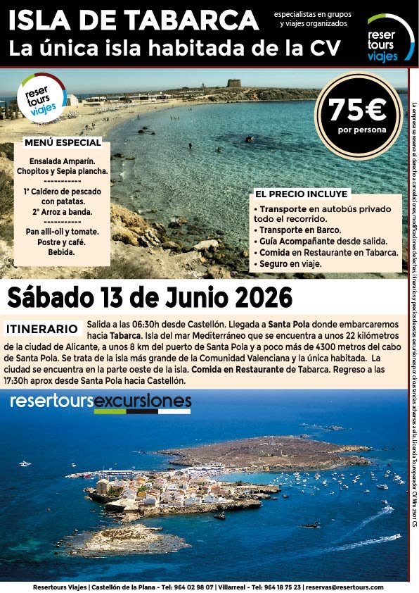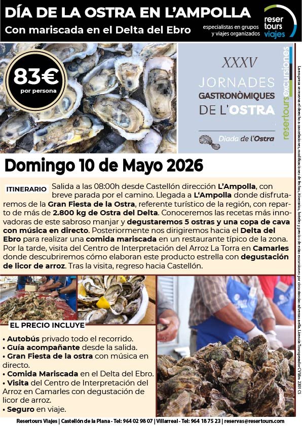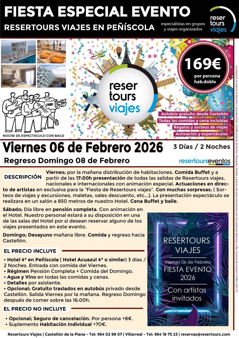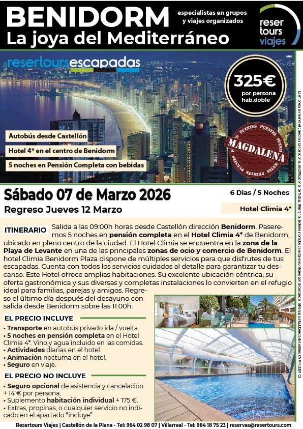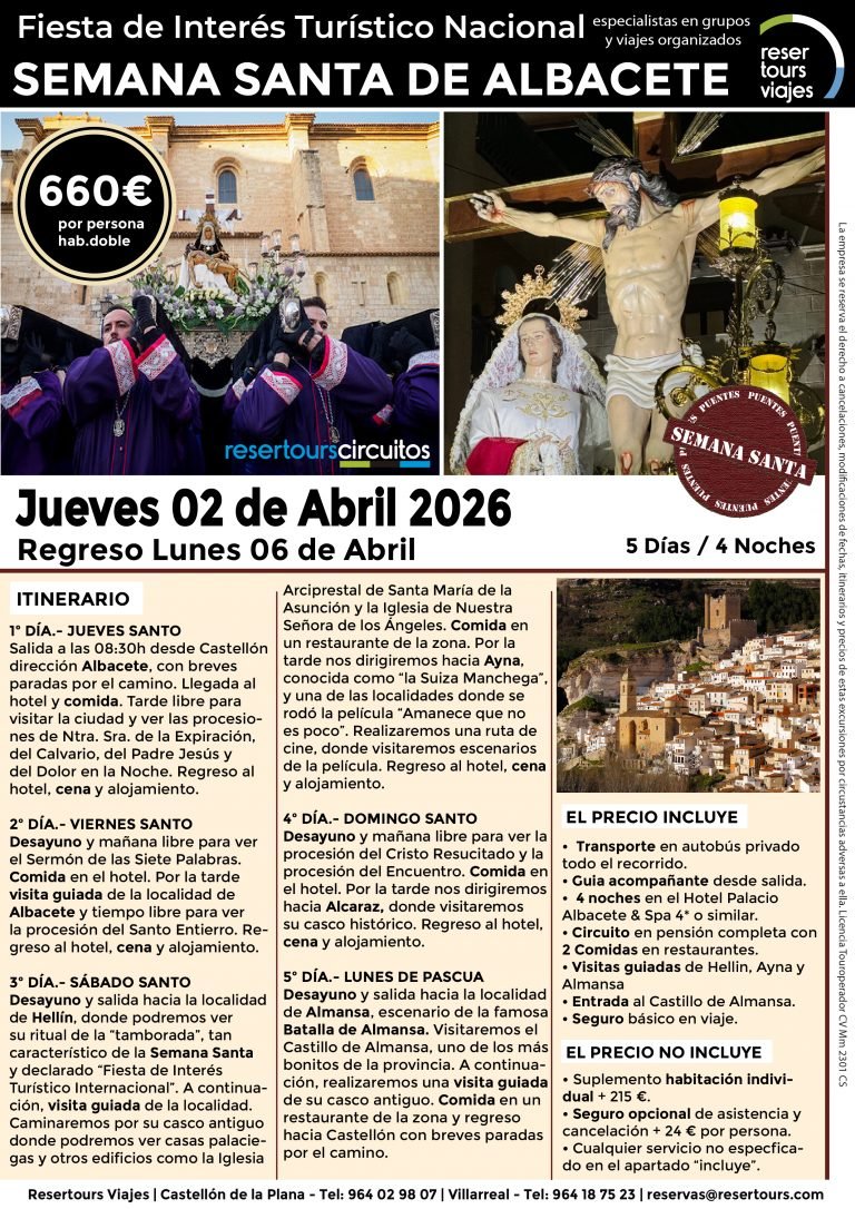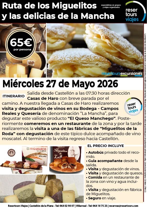 Política de privacidad y protección de datos : En cumplimiento de lo dispuesto en el Reglamento General de Protección de Datos Reglamento UE 2016/679, le informamos de que los datos de carácter personal incorporados al presente documento, se integrarán en un fichero de titularidad de RESERTOURS S.L sociedad Inscrita en el Registro Mercantil de Castellón.  Domiciliado en la calle Herrero nº 18 bajo del 12002 de Castellón de la Plana y en adelante RESERTOURS VIAJES. Los datos serán utilizados con la finalidad de gestionar todas las cuestiones relacionadas con su solicitud y en ejecución de las posteriores relaciones que puedan establecerse entre usted y RESERTOURS VIAJES Le informamos también que los datos personales suministrados no serán cedidos ni comunicados a terceras personas sin informarle previamente y requerir su consentimiento. El usuario será el único responsable a causa de la cumplimentación de los formularios con datos falsos, inexactos, incompletos o no actualizados. El periodo de conservación de los datos personales variará en función del servicio que pueda llegar a contratar. En cualquier caso, se conservarán sus datos durante la vigencia de la relación contractual. Una vez finalizada ésta, mantendremos sus datos bloqueados durante los plazos de prescripción de las obligaciones que hayan podido nacer del tratamiento y/o los plazos legales aplicables, quedando a disposición de las autoridades competentes, para la atención de las posibles responsabilidades nacidas del tratamiento. Podrá ejercitar los derechos de acceso, rectificación, cancelación y oposición dirigiéndose por escrito a RESERTOURS VIAJES mediante carta acompañada de copia de su D.N.I. dirigida al Responsable de Seguridad en la dirección C/ Herrero, nº 18 - 12002 Castellón de la Plana o mediante el formulario de contacto en el que se le indicará email para remitir dichos documentos. Formularios De Contacto: Para cumplir la LOPD plenamente en los formularios de contacto donde se recojan datos personales, y según informe jurídico de la AEPD en este aspecto, en cada formulario de contacto donde el cliente introduzca sus datos, hay que añadir una casilla tipo “check” que no esté marcada previamente y antes del botón de Envío, con un link a la Política de Privacidad. Ejemplo: [ ] Acepto la Política de Privacidad No se debe poder enviar el formulario si no está dicha casilla marcada Nuestro sitio web utiliza “cookies" para recabar información sobre la forma de utilización del Sitio Web. Si deseas obtener información más detallada sobre cómo RESERTOURS VIAJES utiliza las cookies, consulta la Política de cookies.
