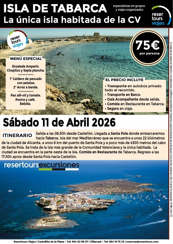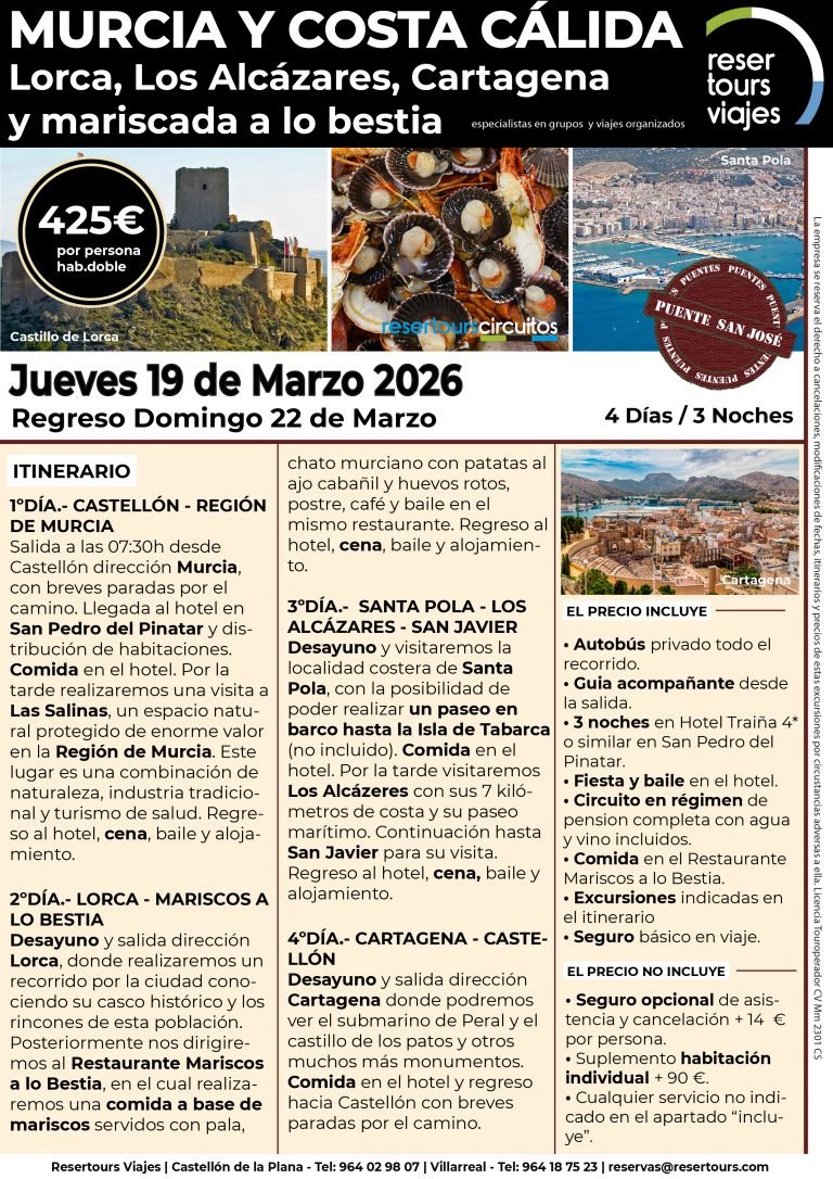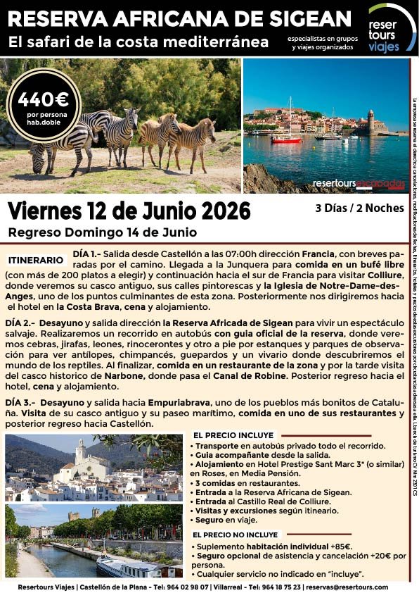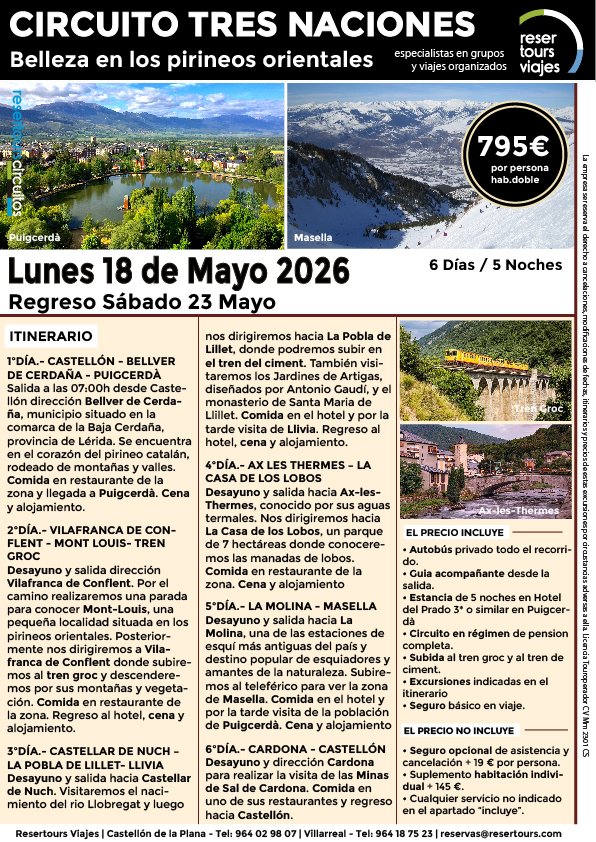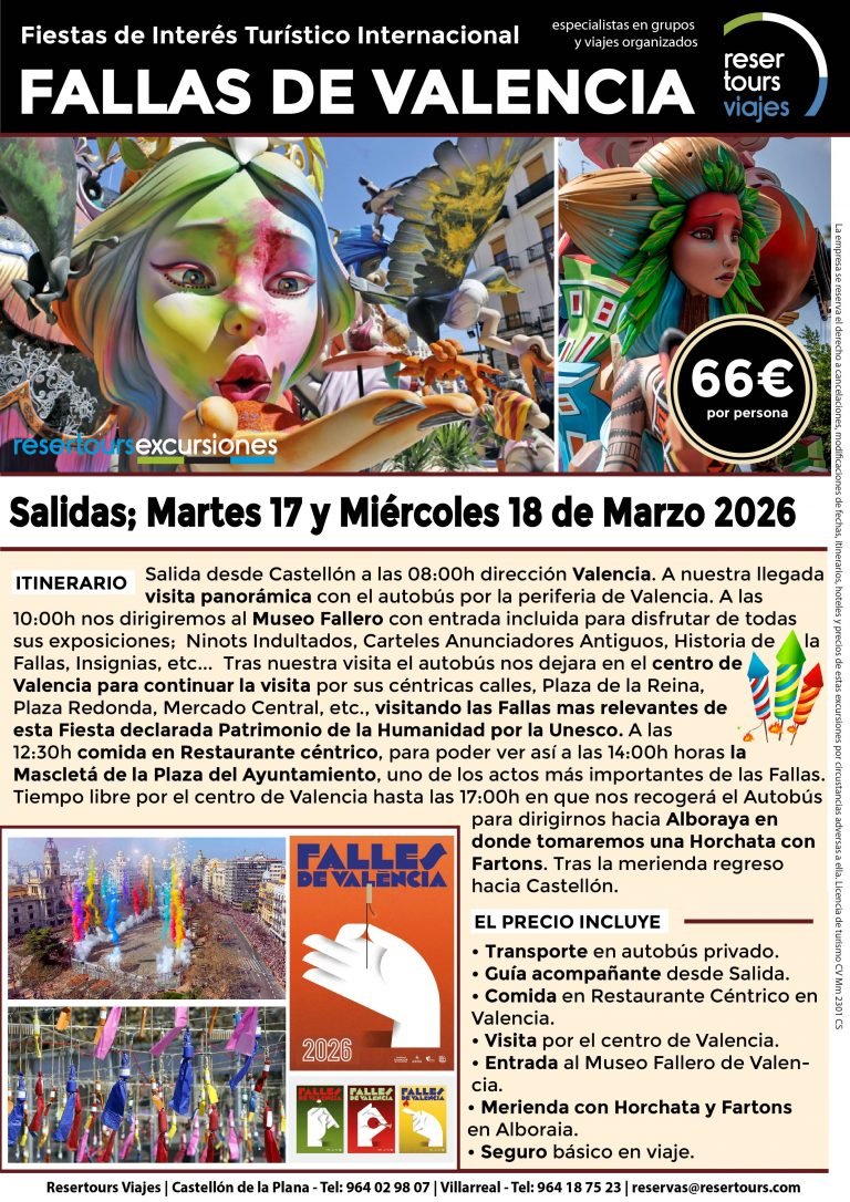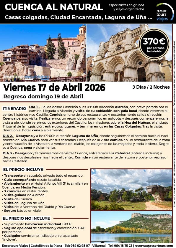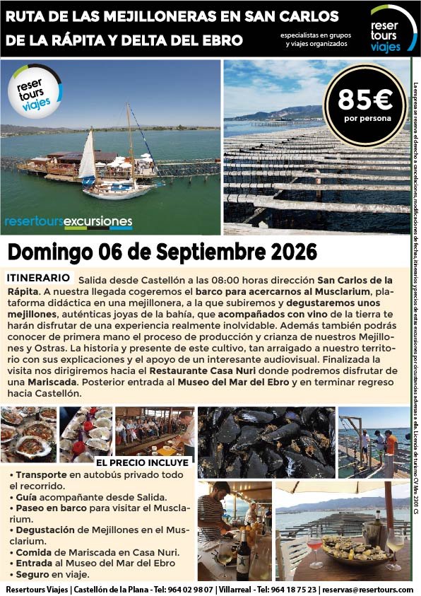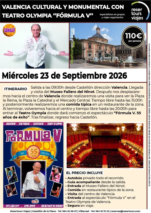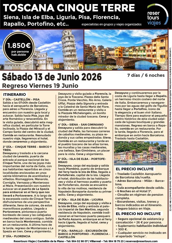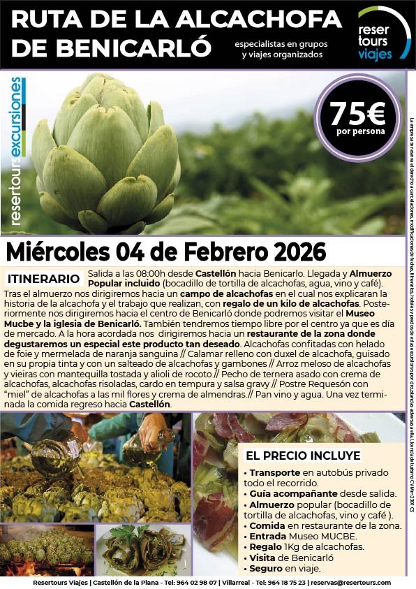 Política de privacidad y protección de datos : En cumplimiento de lo dispuesto en el Reglamento General de Protección de Datos Reglamento UE 2016/679, le informamos de que los datos de carácter personal incorporados al presente documento, se integrarán en un fichero de titularidad de RESERTOURS S.L sociedad Inscrita en el Registro Mercantil de Castellón.  Domiciliado en la calle Herrero nº 18 bajo del 12002 de Castellón de la Plana y en adelante RESERTOURS VIAJES. Los datos serán utilizados con la finalidad de gestionar todas las cuestiones relacionadas con su solicitud y en ejecución de las posteriores relaciones que puedan establecerse entre usted y RESERTOURS VIAJES Le informamos también que los datos personales suministrados no serán cedidos ni comunicados a terceras personas sin informarle previamente y requerir su consentimiento. El usuario será el único responsable a causa de la cumplimentación de los formularios con datos falsos, inexactos, incompletos o no actualizados. El periodo de conservación de los datos personales variará en función del servicio que pueda llegar a contratar. En cualquier caso, se conservarán sus datos durante la vigencia de la relación contractual. Una vez finalizada ésta, mantendremos sus datos bloqueados durante los plazos de prescripción de las obligaciones que hayan podido nacer del tratamiento y/o los plazos legales aplicables, quedando a disposición de las autoridades competentes, para la atención de las posibles responsabilidades nacidas del tratamiento. Podrá ejercitar los derechos de acceso, rectificación, cancelación y oposición dirigiéndose por escrito a RESERTOURS VIAJES mediante carta acompañada de copia de su D.N.I. dirigida al Responsable de Seguridad en la dirección C/ Herrero, nº 18 - 12002 Castellón de la Plana o mediante el formulario de contacto en el que se le indicará email para remitir dichos documentos. Formularios De Contacto: Para cumplir la LOPD plenamente en los formularios de contacto donde se recojan datos personales, y según informe jurídico de la AEPD en este aspecto, en cada formulario de contacto donde el cliente introduzca sus datos, hay que añadir una casilla tipo “check” que no esté marcada previamente y antes del botón de Envío, con un link a la Política de Privacidad. Ejemplo: [ ] Acepto la Política de Privacidad No se debe poder enviar el formulario si no está dicha casilla marcada Nuestro sitio web utiliza “cookies" para recabar información sobre la forma de utilización del Sitio Web. Si deseas obtener información más detallada sobre cómo RESERTOURS VIAJES utiliza las cookies, consulta la Política de cookies.
