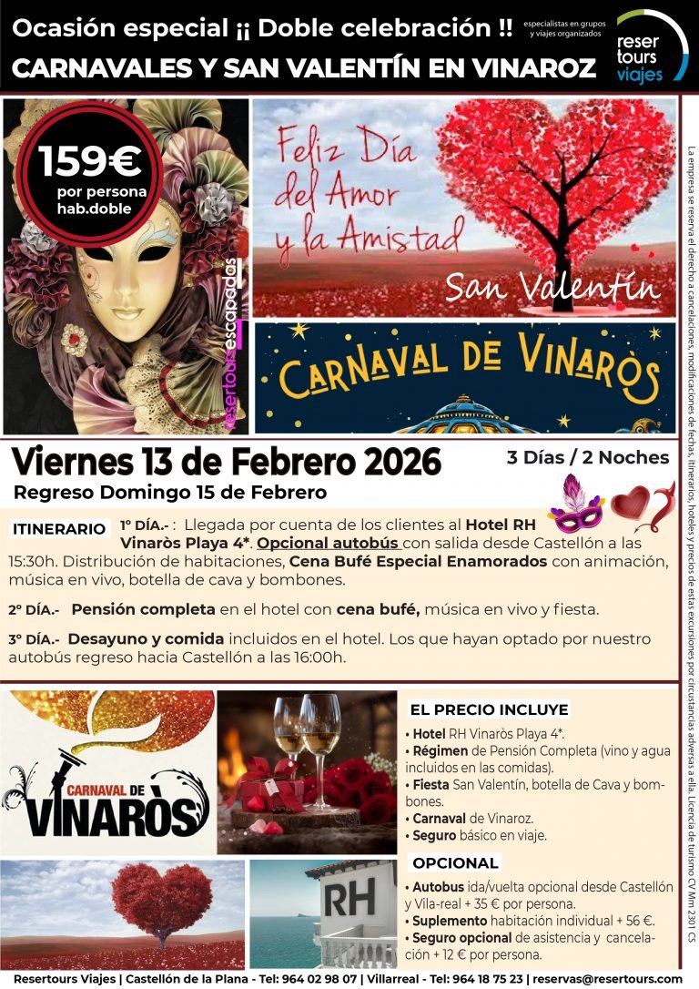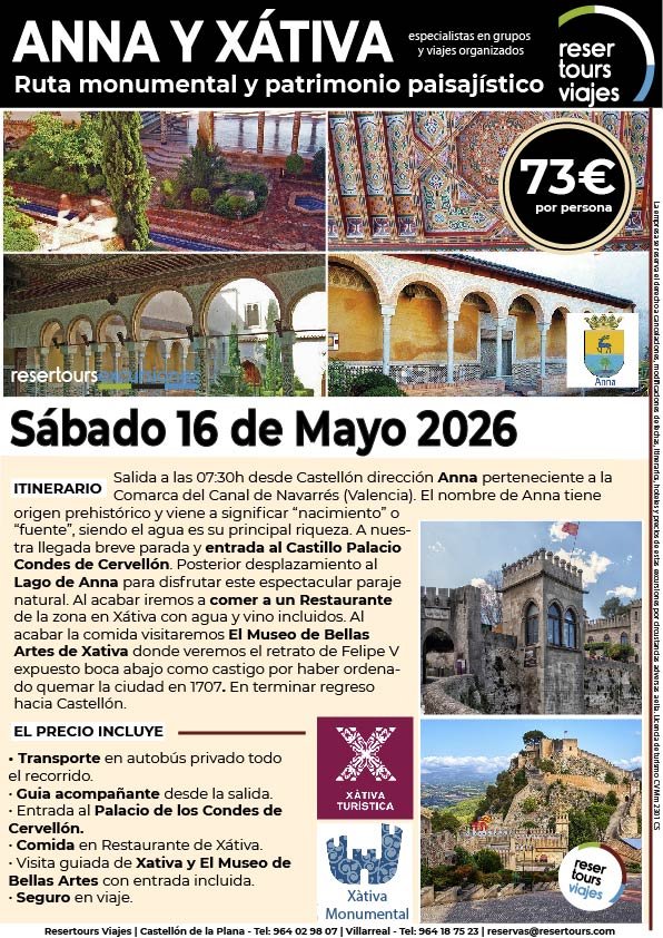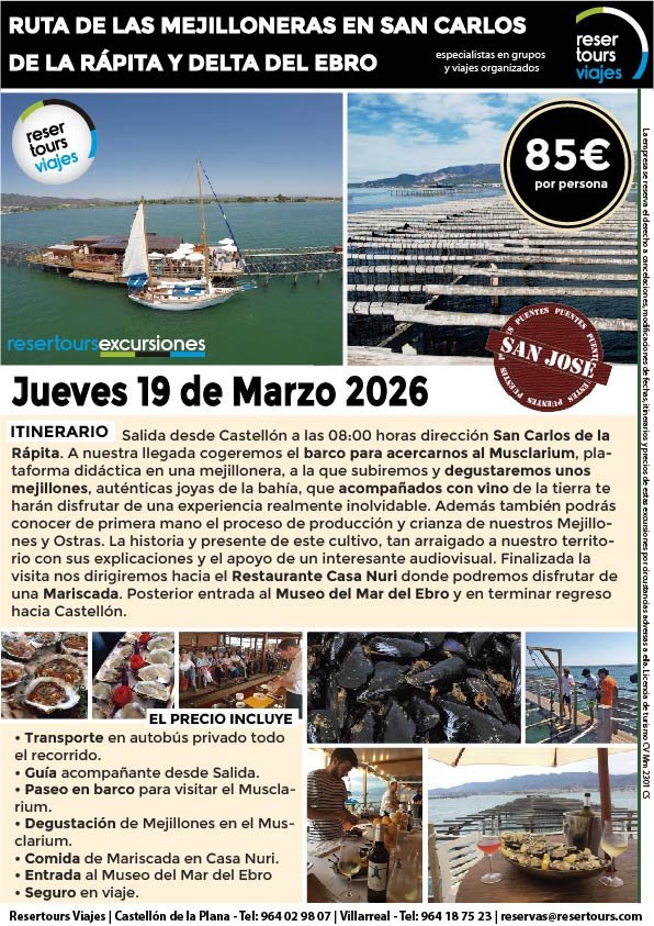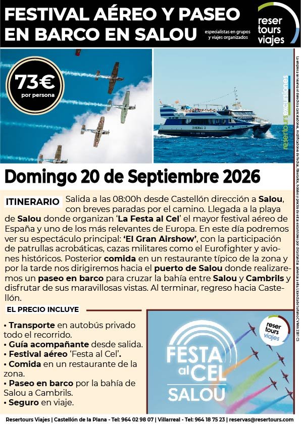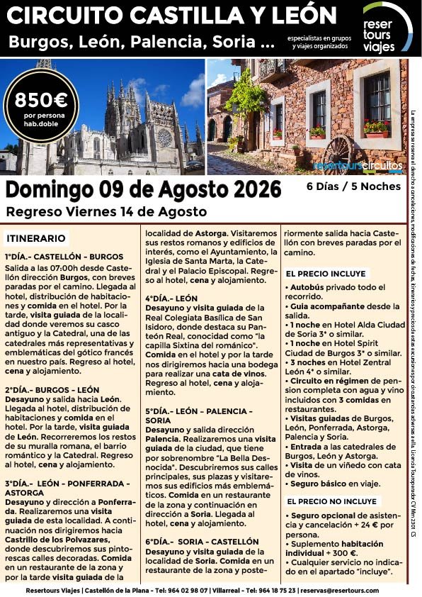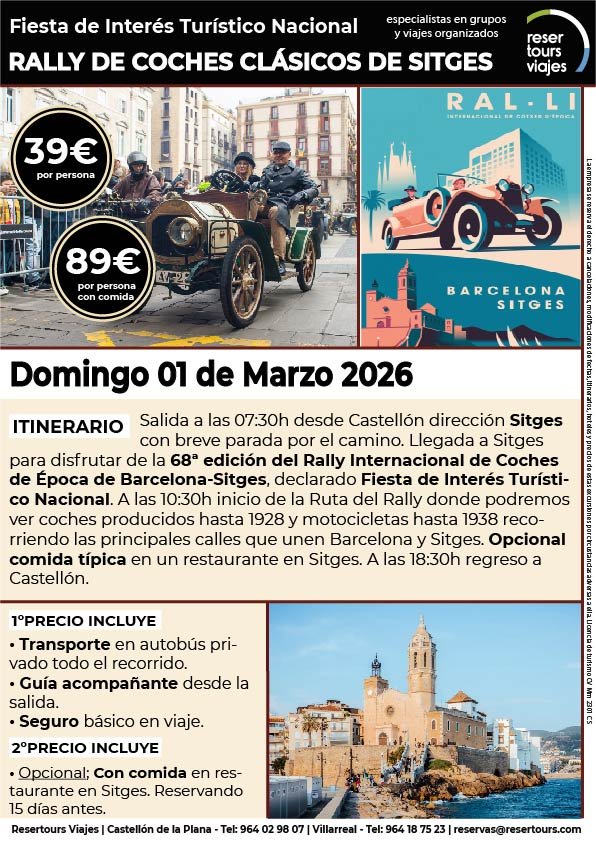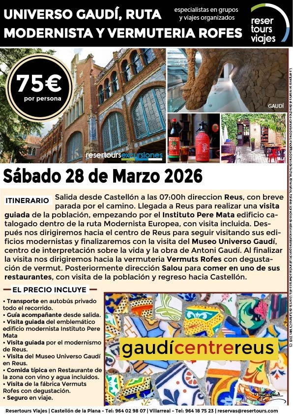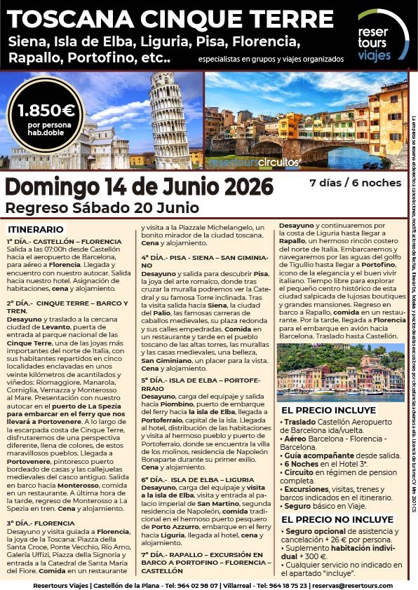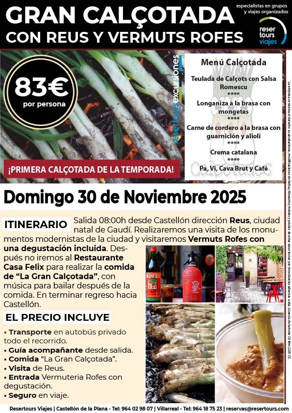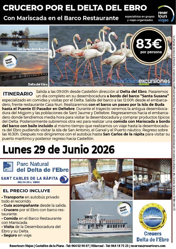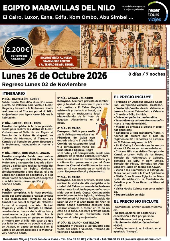 Política de privacidad y protección de datos : En cumplimiento de lo dispuesto en el Reglamento General de Protección de Datos Reglamento UE 2016/679, le informamos de que los datos de carácter personal incorporados al presente documento, se integrarán en un fichero de titularidad de RESERTOURS S.L sociedad Inscrita en el Registro Mercantil de Castellón.  Domiciliado en la calle Herrero nº 18 bajo del 12002 de Castellón de la Plana y en adelante RESERTOURS VIAJES. Los datos serán utilizados con la finalidad de gestionar todas las cuestiones relacionadas con su solicitud y en ejecución de las posteriores relaciones que puedan establecerse entre usted y RESERTOURS VIAJES Le informamos también que los datos personales suministrados no serán cedidos ni comunicados a terceras personas sin informarle previamente y requerir su consentimiento. El usuario será el único responsable a causa de la cumplimentación de los formularios con datos falsos, inexactos, incompletos o no actualizados. El periodo de conservación de los datos personales variará en función del servicio que pueda llegar a contratar. En cualquier caso, se conservarán sus datos durante la vigencia de la relación contractual. Una vez finalizada ésta, mantendremos sus datos bloqueados durante los plazos de prescripción de las obligaciones que hayan podido nacer del tratamiento y/o los plazos legales aplicables, quedando a disposición de las autoridades competentes, para la atención de las posibles responsabilidades nacidas del tratamiento. Podrá ejercitar los derechos de acceso, rectificación, cancelación y oposición dirigiéndose por escrito a RESERTOURS VIAJES mediante carta acompañada de copia de su D.N.I. dirigida al Responsable de Seguridad en la dirección C/ Herrero, nº 18 - 12002 Castellón de la Plana o mediante el formulario de contacto en el que se le indicará email para remitir dichos documentos. Formularios De Contacto: Para cumplir la LOPD plenamente en los formularios de contacto donde se recojan datos personales, y según informe jurídico de la AEPD en este aspecto, en cada formulario de contacto donde el cliente introduzca sus datos, hay que añadir una casilla tipo “check” que no esté marcada previamente y antes del botón de Envío, con un link a la Política de Privacidad. Ejemplo: [ ] Acepto la Política de Privacidad No se debe poder enviar el formulario si no está dicha casilla marcada Nuestro sitio web utiliza “cookies" para recabar información sobre la forma de utilización del Sitio Web. Si deseas obtener información más detallada sobre cómo RESERTOURS VIAJES utiliza las cookies, consulta la Política de cookies.