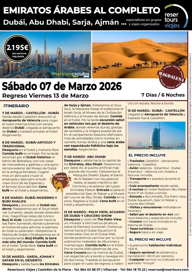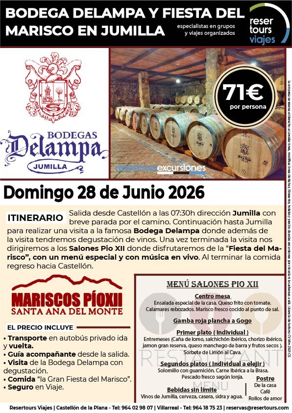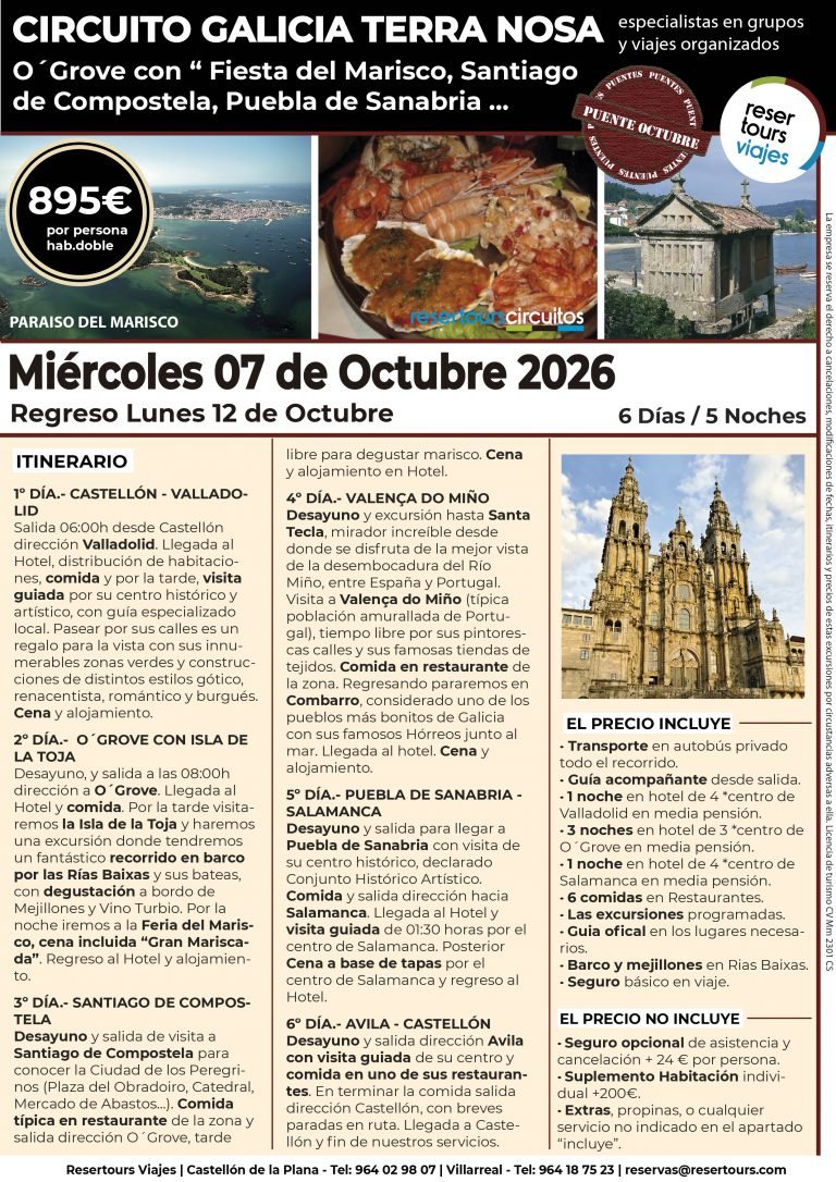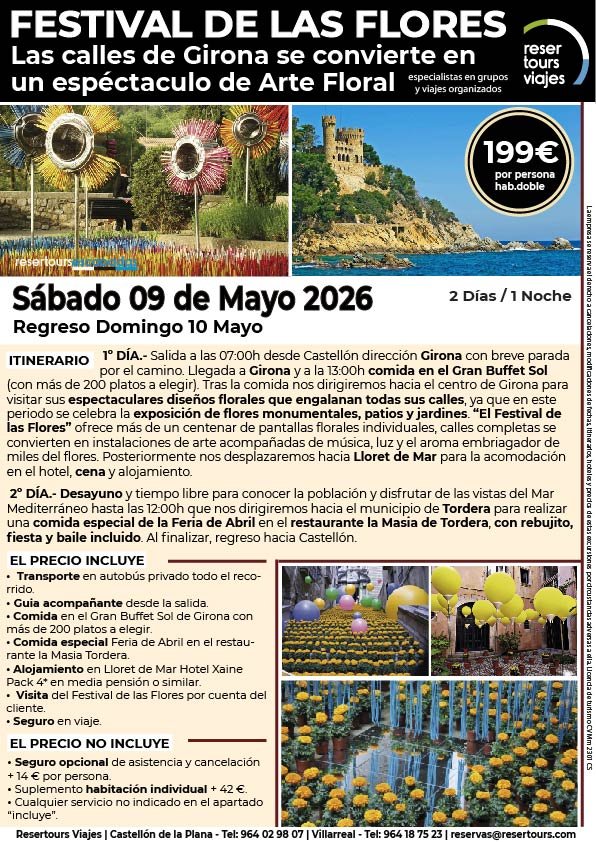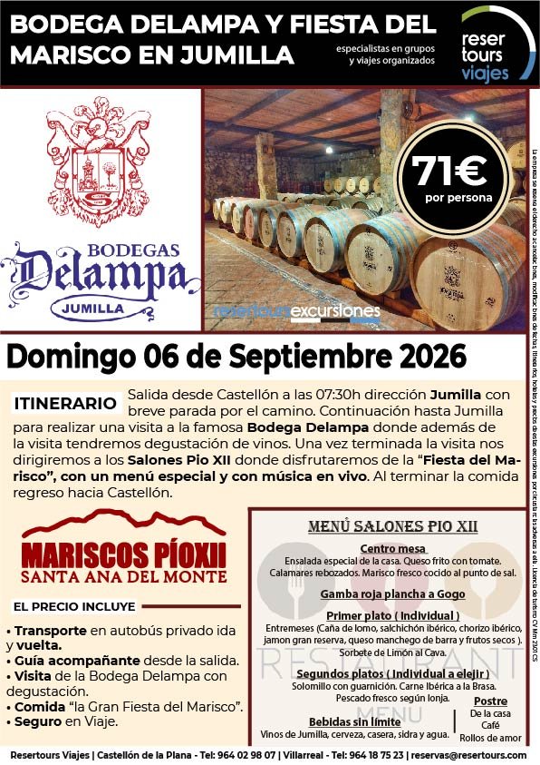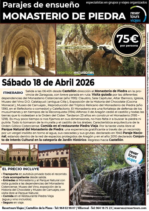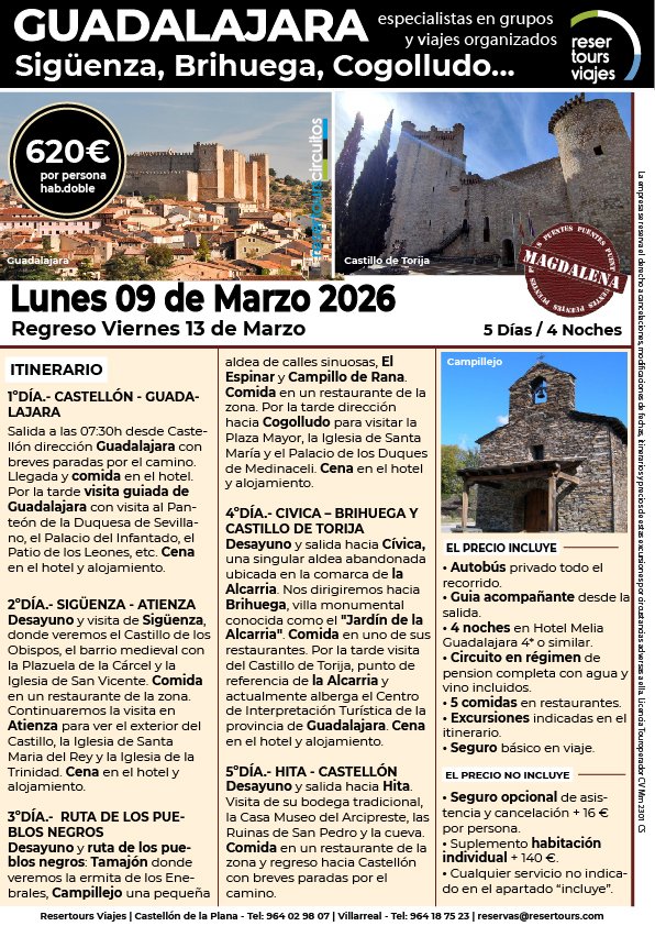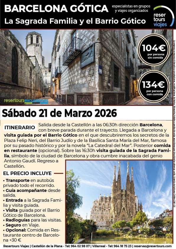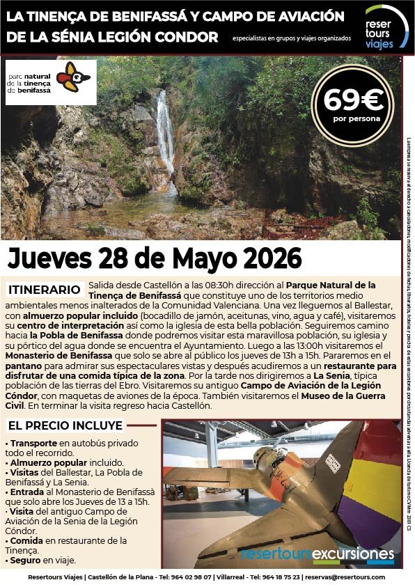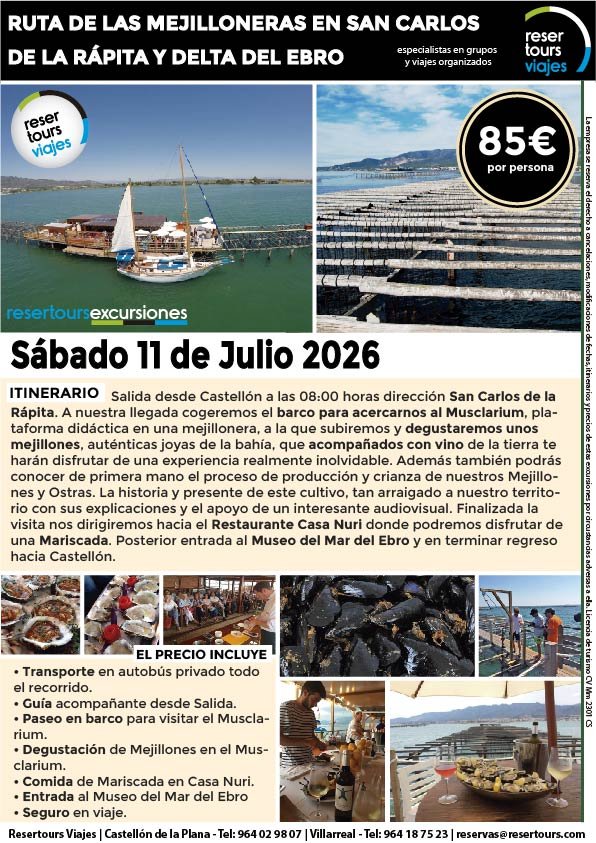 Política de privacidad y protección de datos : En cumplimiento de lo dispuesto en el Reglamento General de Protección de Datos Reglamento UE 2016/679, le informamos de que los datos de carácter personal incorporados al presente documento, se integrarán en un fichero de titularidad de RESERTOURS S.L sociedad Inscrita en el Registro Mercantil de Castellón.  Domiciliado en la calle Herrero nº 18 bajo del 12002 de Castellón de la Plana y en adelante RESERTOURS VIAJES. Los datos serán utilizados con la finalidad de gestionar todas las cuestiones relacionadas con su solicitud y en ejecución de las posteriores relaciones que puedan establecerse entre usted y RESERTOURS VIAJES Le informamos también que los datos personales suministrados no serán cedidos ni comunicados a terceras personas sin informarle previamente y requerir su consentimiento. El usuario será el único responsable a causa de la cumplimentación de los formularios con datos falsos, inexactos, incompletos o no actualizados. El periodo de conservación de los datos personales variará en función del servicio que pueda llegar a contratar. En cualquier caso, se conservarán sus datos durante la vigencia de la relación contractual. Una vez finalizada ésta, mantendremos sus datos bloqueados durante los plazos de prescripción de las obligaciones que hayan podido nacer del tratamiento y/o los plazos legales aplicables, quedando a disposición de las autoridades competentes, para la atención de las posibles responsabilidades nacidas del tratamiento. Podrá ejercitar los derechos de acceso, rectificación, cancelación y oposición dirigiéndose por escrito a RESERTOURS VIAJES mediante carta acompañada de copia de su D.N.I. dirigida al Responsable de Seguridad en la dirección C/ Herrero, nº 18 - 12002 Castellón de la Plana o mediante el formulario de contacto en el que se le indicará email para remitir dichos documentos. Formularios De Contacto: Para cumplir la LOPD plenamente en los formularios de contacto donde se recojan datos personales, y según informe jurídico de la AEPD en este aspecto, en cada formulario de contacto donde el cliente introduzca sus datos, hay que añadir una casilla tipo “check” que no esté marcada previamente y antes del botón de Envío, con un link a la Política de Privacidad. Ejemplo: [ ] Acepto la Política de Privacidad No se debe poder enviar el formulario si no está dicha casilla marcada Nuestro sitio web utiliza “cookies" para recabar información sobre la forma de utilización del Sitio Web. Si deseas obtener información más detallada sobre cómo RESERTOURS VIAJES utiliza las cookies, consulta la Política de cookies.