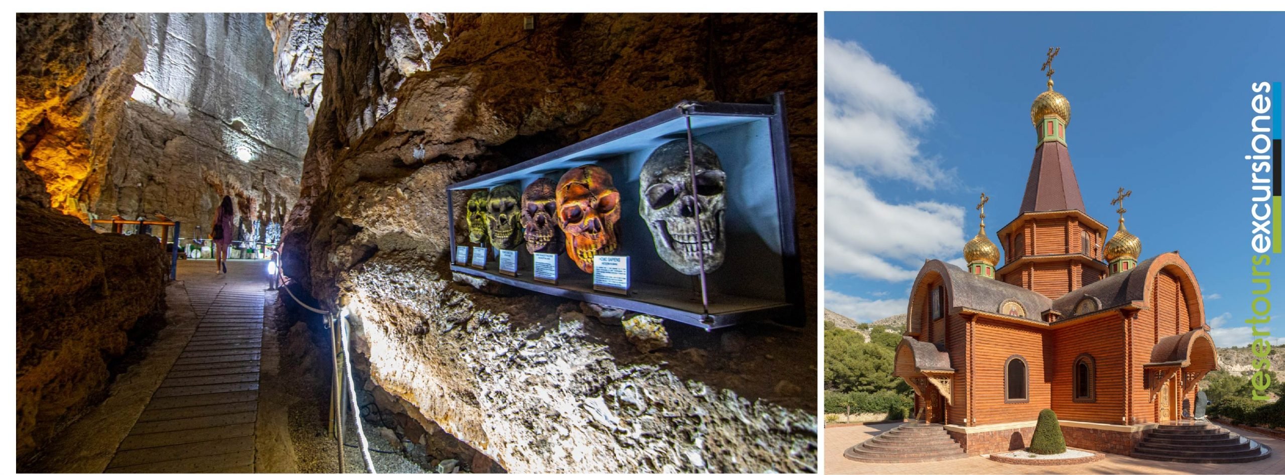 Salida a las 07:30h desde Castellón dirección la Marina Alta, con breve parada por el camino. Llegada a La Cueva de las Calaveras en Benidoleig (Alicante), una de las grutas más antiguas de toda la Comunidad Valenciana. Esta cavidad de más de 400 metros de longitud permite al visitante realizar un viaje en el tiempo y conocer cómo vivieron hace mucho tiempo nuestros antepasados. Durante el recorrido se pueden observar estalactitas, estalagmitas, cúpulas de más de 20m de altura, fósiles y restos de huesos. Tras la visita, nos dirigiremos hacia Altea, uno de los pueblos más bonitos y fotogénicos de la Costa Blanca. Su combinación de casas blancas, calles empedradas y las icónicas cúpulas azules la convierten en un destino imprescindible. Visitaremos su casco antiguo, la Iglesia de Nuestra Señora del Consuelo con su cúpula de cerámica azul y la Plaza de la Iglesia. Después nos dirigiremos hacia el Puerto de Calpe para realizar una comida mariscada en uno de sus restaurantes. Al terminar volveremos a Altea para visitar El Templo del Arcángel Miguel, conocido por ser el primer templo de la Iglesia Ortodoxa Rusa construido en España y en toda la Península Ibérica. Posterior regreso hacia Castellón.