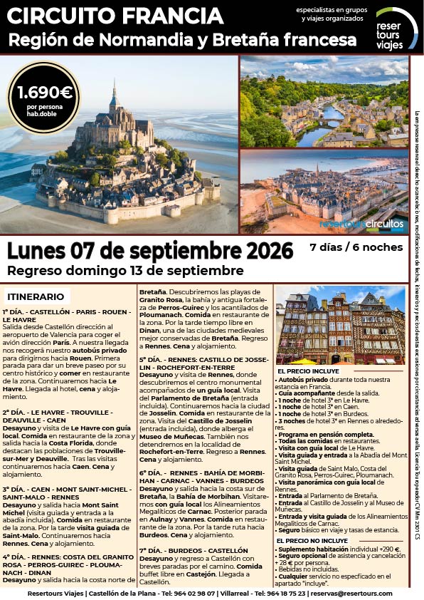 • Autobús privado durante todo el circuito. • Guía acompañante desde la salida. • 1 noche de hotel 3* en Le Havre. • 1 noche de hotel 3* en Caen. • 1 noche de hotel 3* en Burdeos. • 3 noches de hotel 3* en Rennes o alrededores.• Programa en pensión completa. • Todas las comidas en restaurantes. • Visita con guía local de Le Havre. • Visita guiada y entrada a la Abadía del Mont Saint Michel. • Visita guiada de Saint Malo, Costa del Granito Rosa, Perros-Guirec, Ploumanach. • Visita panorámica con guía local de Rennes. • Entrada al Parlamento de Bretaña. • Entrada al Castillo de Josselin y al Museo de Muñecas. • Entrada y visita guiada de los Alineamientos Megalíticos de Carnac. • Seguro básico en viaje y tasas de estancia.
