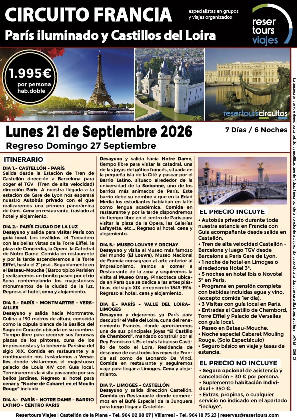 • Autobús privado durante toda nuestra estancia en Francia con Guia acompañante desde salida en Castellón. • Tren de alta velocidad Castellón – Barcelona y luego TGV desde Barcelona a Paris Gare de Lyon. • 1 noche de hotel en Limoges o alrededores Hotel 3*. • 5 noches en hotel Ibis o Novotel 3* en Paris. • Programa en pensión completa con bebidas incluidas agua y vino, (excepto comida 1er día). • 3 Visitas con guía local en Paris. • Entradas al Castillo de Chambord, Torre Effiel y Palacio de Versalles con guía local. • Paseo en Bateau-Mouche. • Noche especial Cabaret Mouling Rouge. (Solo Espectáculo) • Seguro básico en viaje y tasas de estancia.