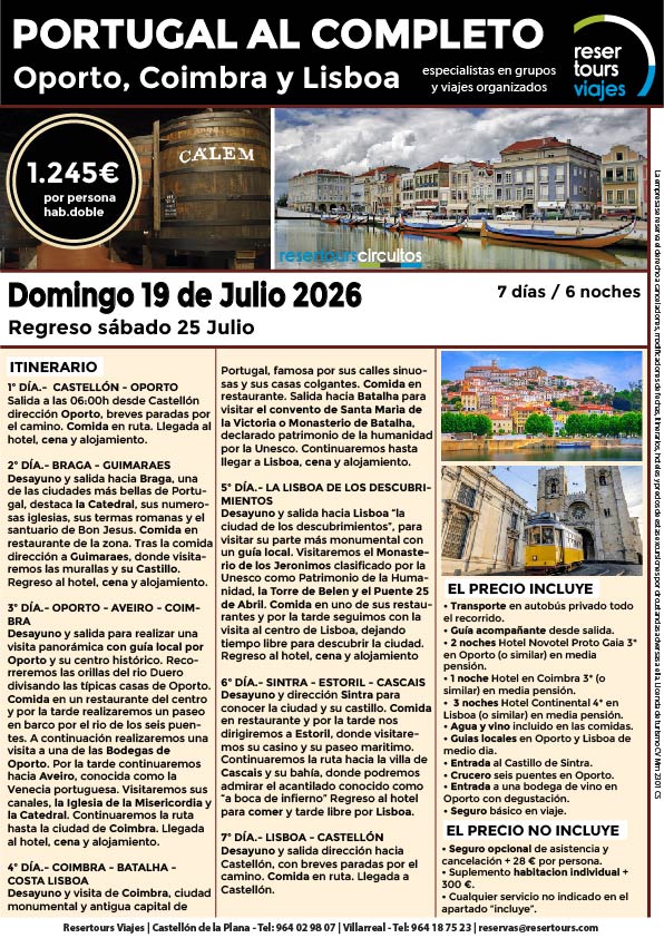 • Guía acompañante desde salida. • 2 noches Hotel Novotel Proto Gaia 3* en Oporto (o similar) en media pensión. • 1 noche Hotel en Coimbra 3* (o similar) en media pensión. • 3 noches Hotel Continental 4* en Lisboa (o similar) en media pensión. • Agua y vino incluido en las comidas.