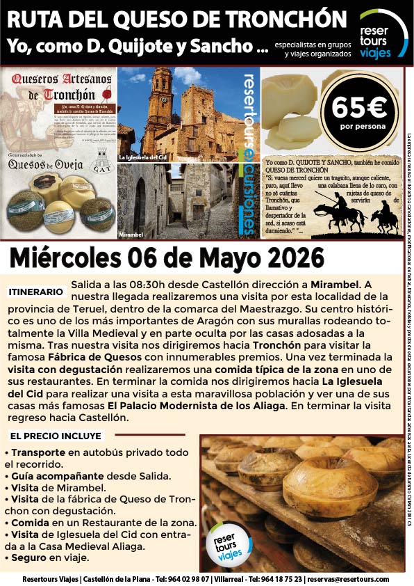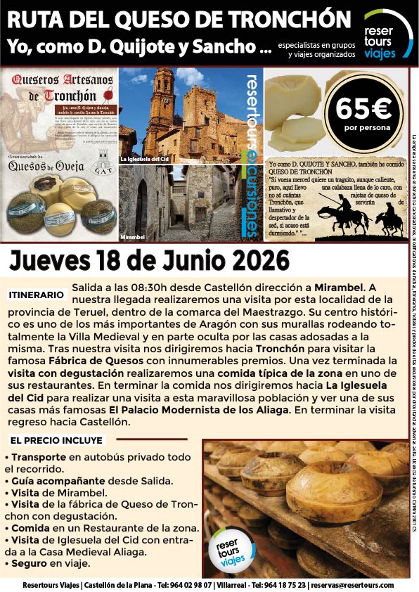 • Guía acompañante desde Salida. • Visita de Mirambel. • Visita de Tronchón. • Visita de la fabrica de Queso de Tronchon con degustación.