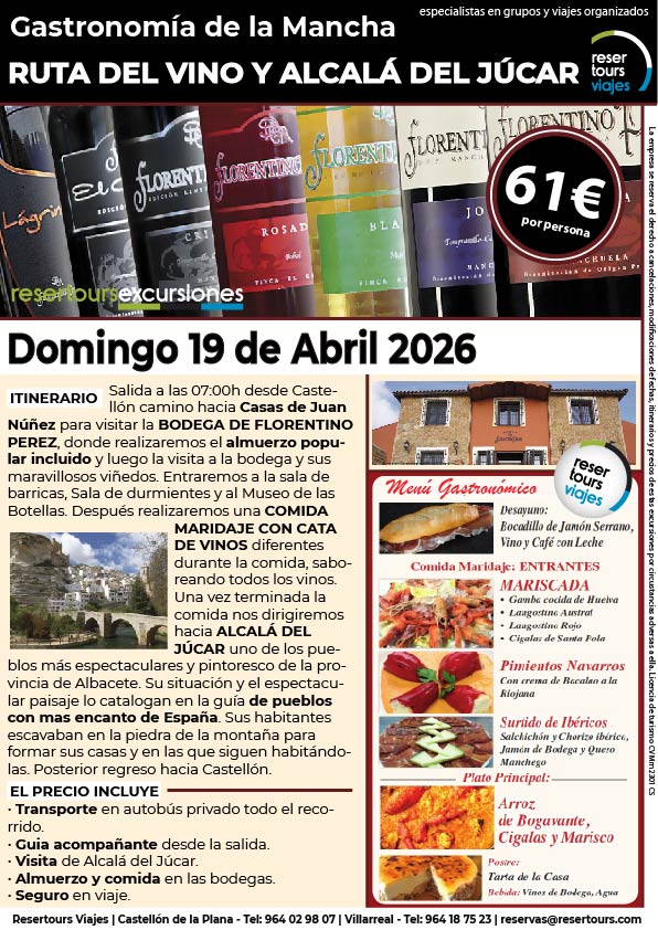 RUTA DEL VINO Y ALCALÁ DEL JÚCAR "Gastronomía de la Mancha” (Con Plazas)