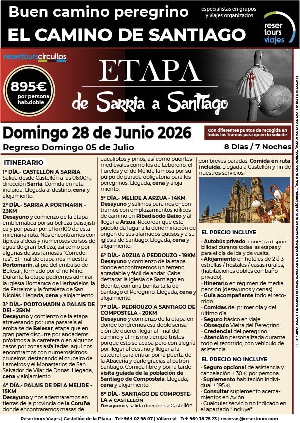 • Autobús privado a nuestra disponibilidad durante todas las etapas y para el día de ida y de vuelta. • Alojamiento en hoteles de 2 ó 3 estrellas / hostales / casas rurales, (habitaciones dobles con baño privado). • Itinerario en régimen de media pensión de desayunos y cenas. • Guía acompañante con vehículo durante todo el recorrido. • Comidas del primer día y del ultimo día con vino y agua incluidos. • Dossier informativo del viaje. • Obsequio Vieira del Peregrino. • Credencial del Peregrino. • Seguro en viaje.