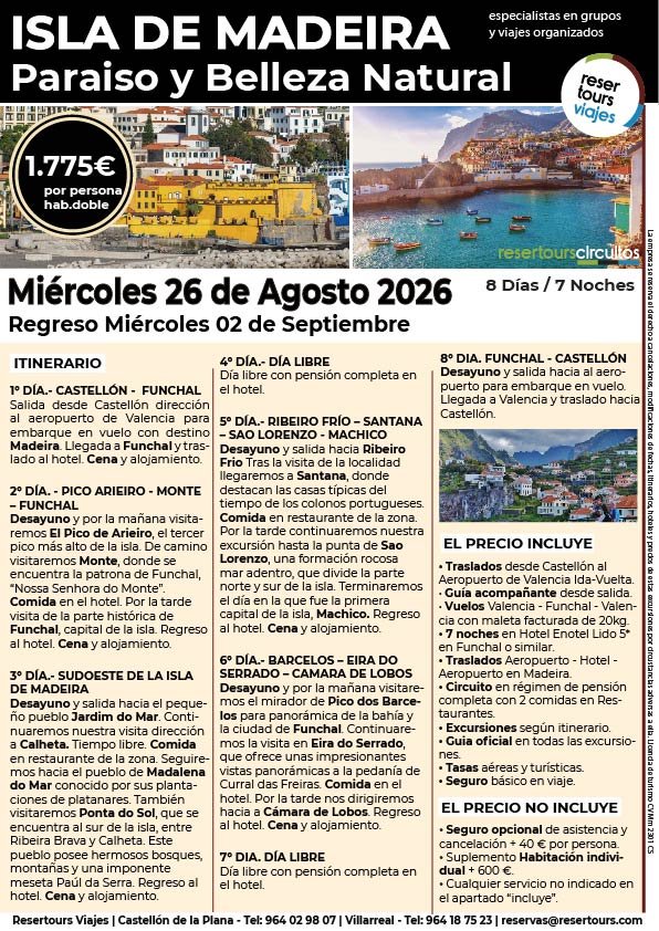 • Traslados desde Castellón al Aeropuerto de Valencia Ida-Vuelta. • Guía acompañante desde salida. • Vuelos Valencia – Funchal – Valencia con maleta facturada de 20kg. • 7 noches en Hotel Enotel Lido 5* en Funchal o similar. • Traslados Aeropuerto – Hotel – Aeropuerto en Madeira.