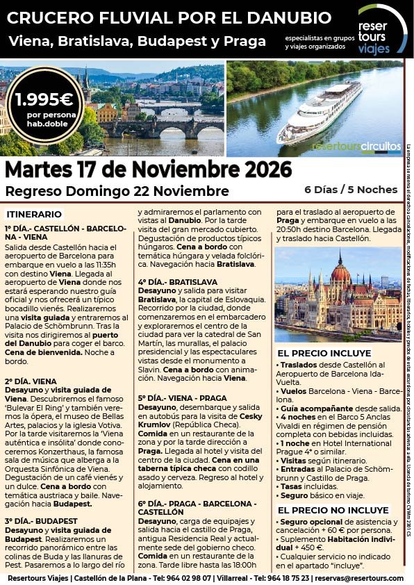 CRUCERO FLUVIAL POR EL DANUBIO "Viena, Bratislava, Budapest y Praga" (Con Plazas)