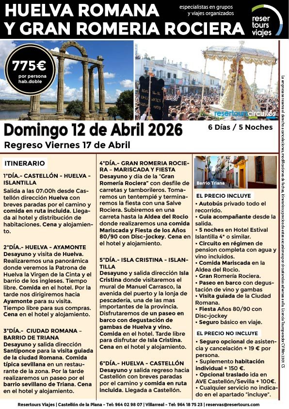 • Régimen Pensión Completa + Comida del Domingo. • Agua y Vino en todas las comidas y cenas. • Detalles por asistente. • Opcional; Gratuito traslados en autobús privado desde Castellón. Salida Viernes por la mañana. Regreso Domingo después de comer sobre las 16:00h.