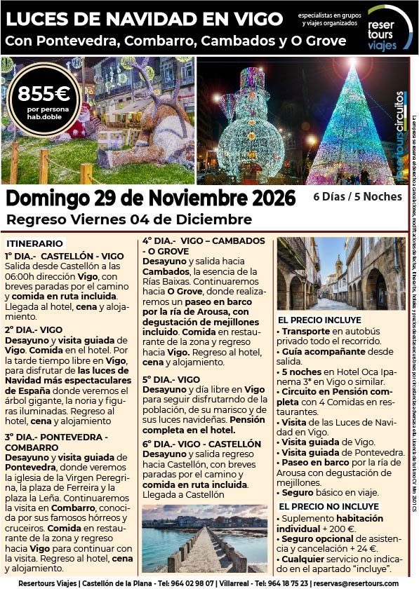 • Guía acompañante desde salida. • 5 noches en Hotel Oca Ipanema 3* en Vigo o similar. • Circuito en Pensión completa con 4 Comidas en restaurantes. • Visita de las Luces de Navidad en Vigo. • Visita guiada de Vigo. • Visita guiada de Pontevedra. • Paseo en barco por la ría de Arousa con degustación de mejillones. • Seguro básico en viaje.